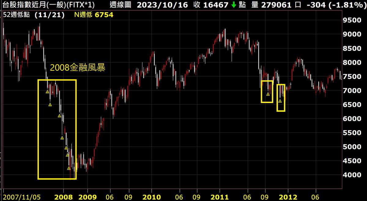 以下圖為例,遇到2008的金融海嘯,52週低點短時間不斷出現,如果一出現52週低點+連續兩根紅日K後就進場,2008金融海嘯可能就會受傷滿重的