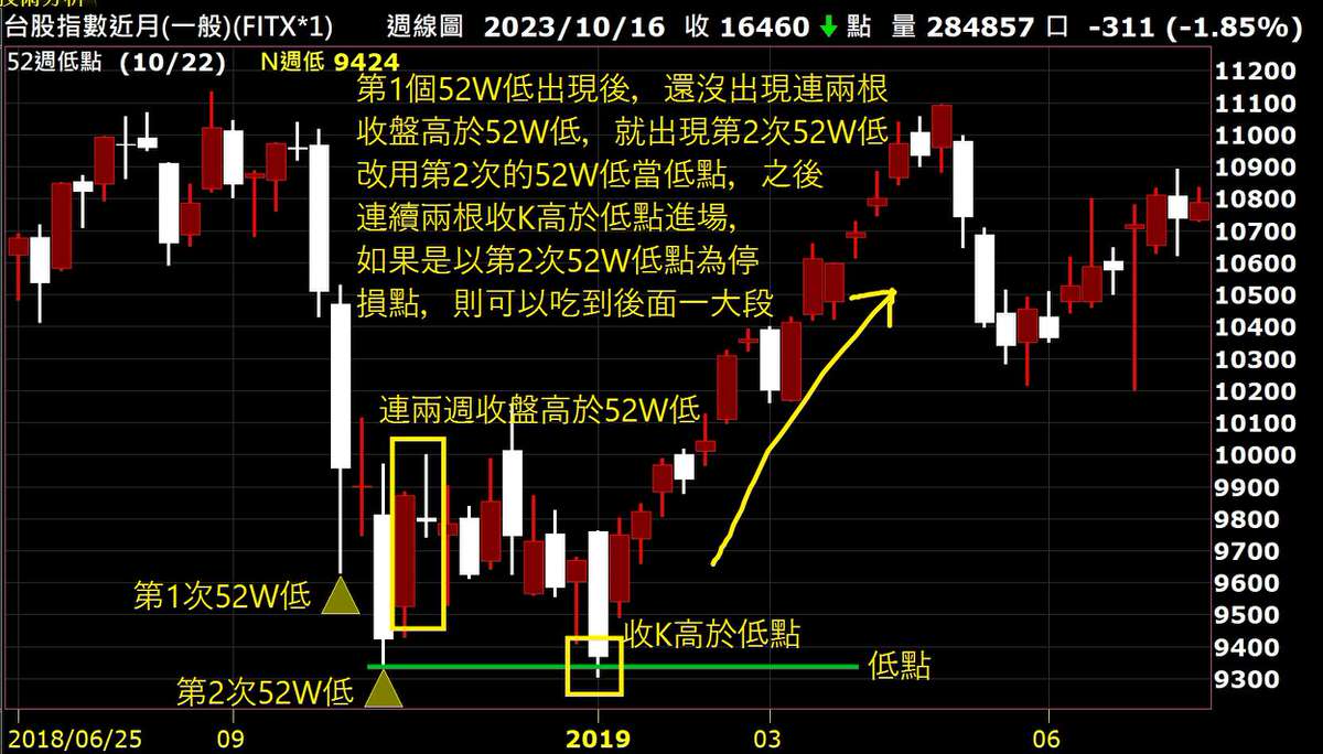 用下圖應該比較容易理解,第一次52W低出現後,都沒有出現週K連兩週高於低點著狀況,然後又出現了第2次的52W低,此時,就以第2次的52W低做觀察,很幸運的,接下來兩週馬上發生收盤價高於52W低,就可以在下一週開盤進場,後面只要沒有收低於52W低就都不出場,這樣的操作應該就很有機會獲利1000點以上