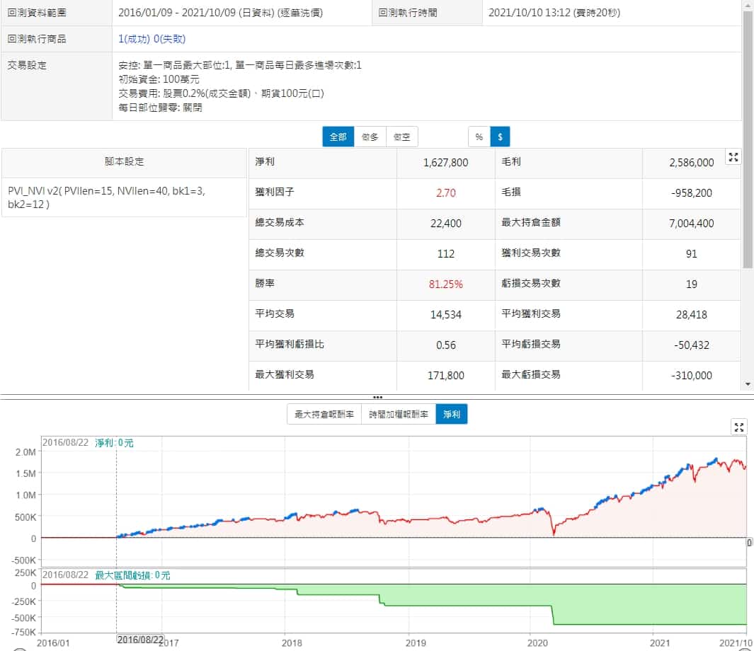 看完後,有點好奇績效是不是真的那麼厲害,嘗試改成XQ的交易程式碼,跑出來的績效似乎還不錯,2016/09到2021/10,獲利接近160萬,最驚人的是勝率竟然高達81.08%,整個權益曲線也算是一路向上,仔細的看了下,最大虧損交易竟然是-31萬,最大區間虧損也高達-62萬,嗯,這應該不是普通人能用的策略~~