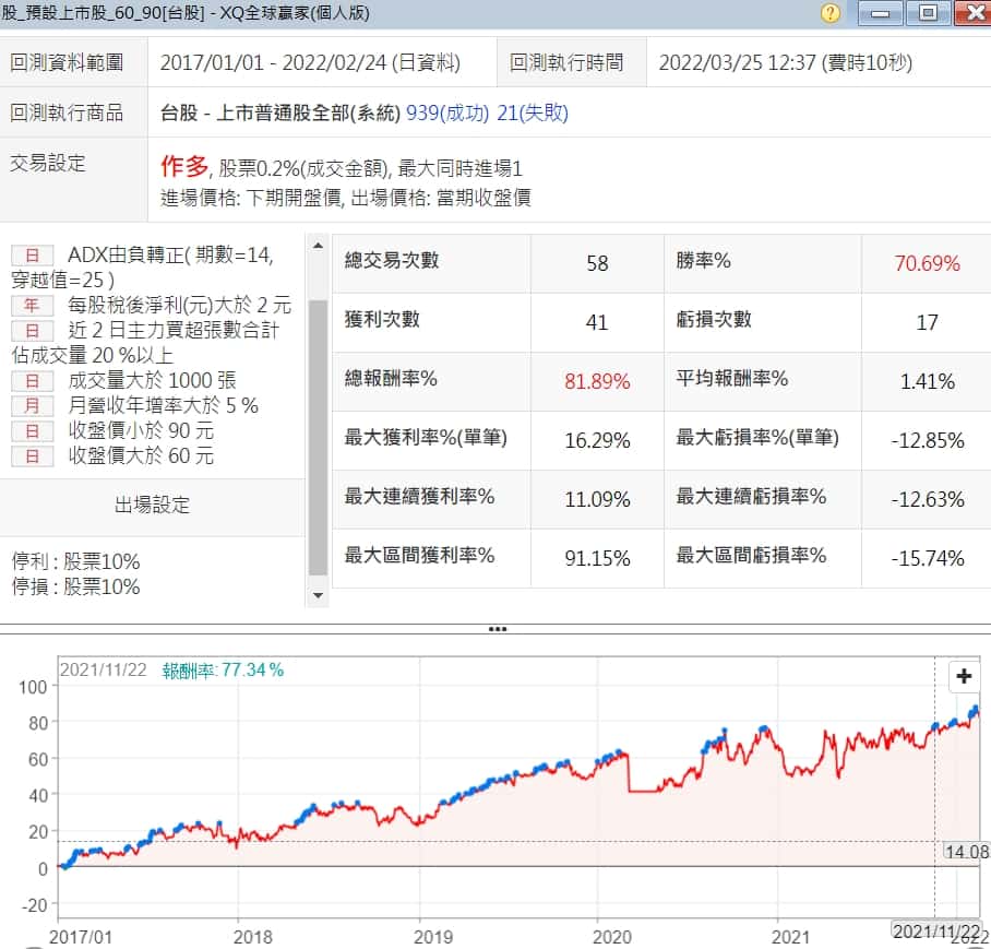 XQ的ADX由負轉正的藍籌股策略,一開始的回測並不很滿意,會有很長一段時間沒有創新高的狀況,在調整參數及價格區間後,勝率可提升到76%