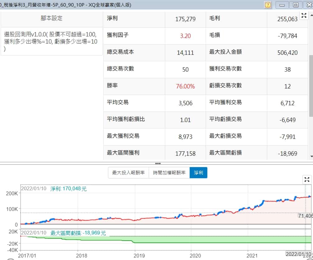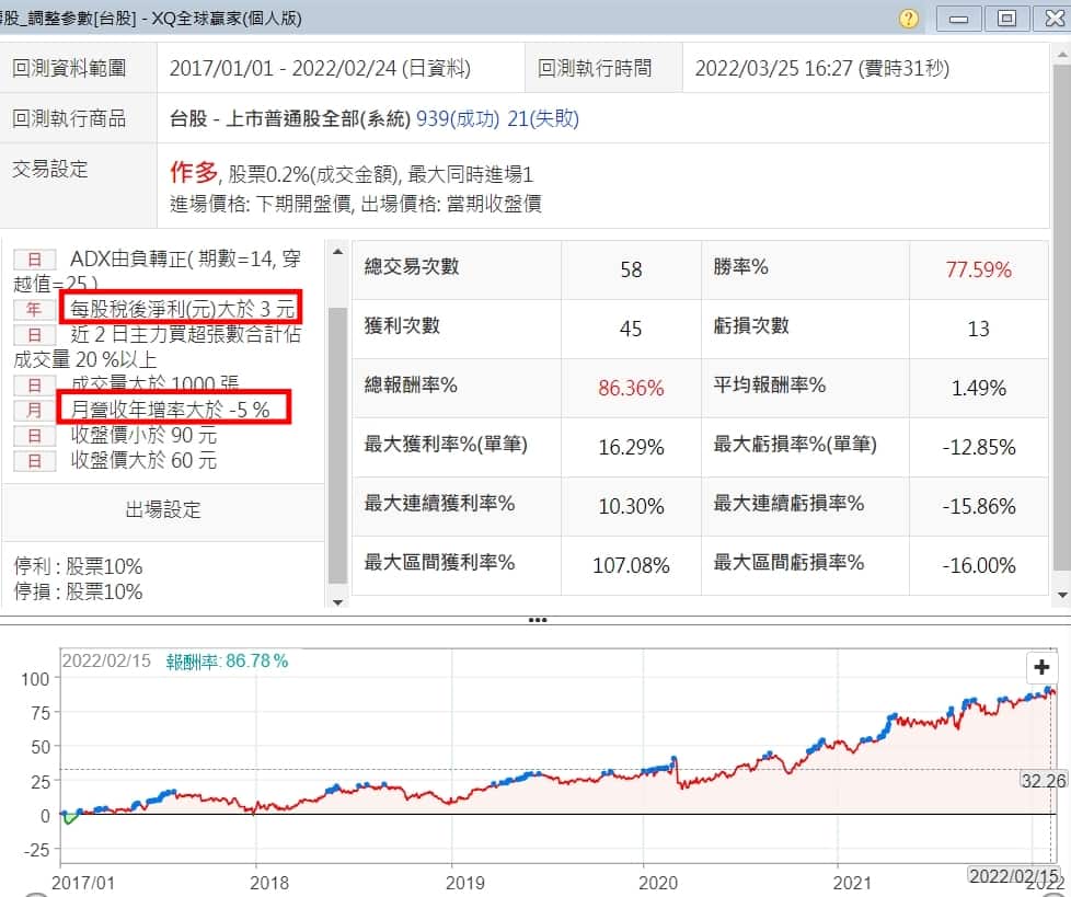 用上面的設定到交易模組回測後,不是很滿意,所以調整了XQ的預設參數,將每股稅後淨利調為大於3元,月營收年增率大於 -5%,注意是負5,得到77.59%的超高勝率