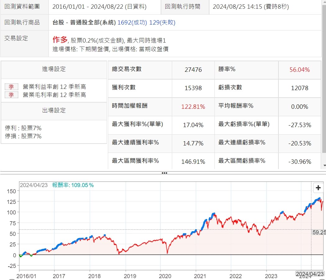 這次只用營業利益率跟營業毛利率兩個當成是預設初始條件,停損利為7%,回測結果顯示,表現並不是太好,也不夠穩定,不過,停損利只有7%的情況下,勝率還能有五成以上,可見該條件還是有點參考價值的