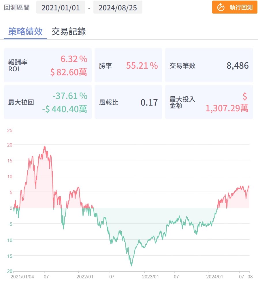 這個策略交易筆數算多,但最大投入金額只有不到50萬,最大拉回也不高,只有不到10%,而且停損利15%,持股應該不會太多,應該是個滿適合多數人交易的策略,可以自己再優化看看