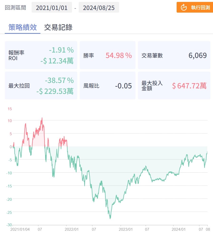 比較步驟1.1~1.4的各回測結果,可以很快的發現,價格跟成交量對於策略績效的改善有著滿大的影響,價格越低回測績效越好,成交量越低,回測績效也不錯,只是那個成交量,一般人應該不會想要拿來操作