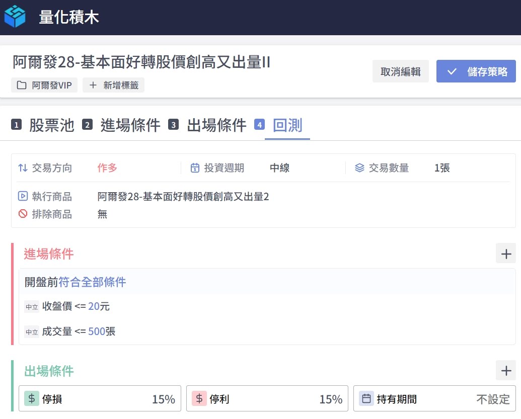 以下為量化積木的設定,停損利為15%,是一個中短線的策略