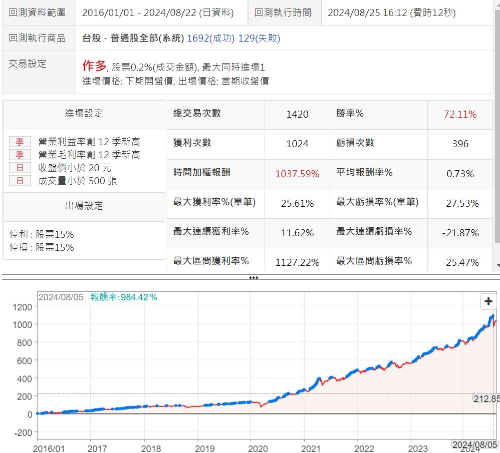 以下回測結果,接採用所有的上市櫃股、毛利率跟利益率條件創12季新高、停損利7%,然後搭配不同的上市櫃股、價格、成交量、跟停損利去做回測