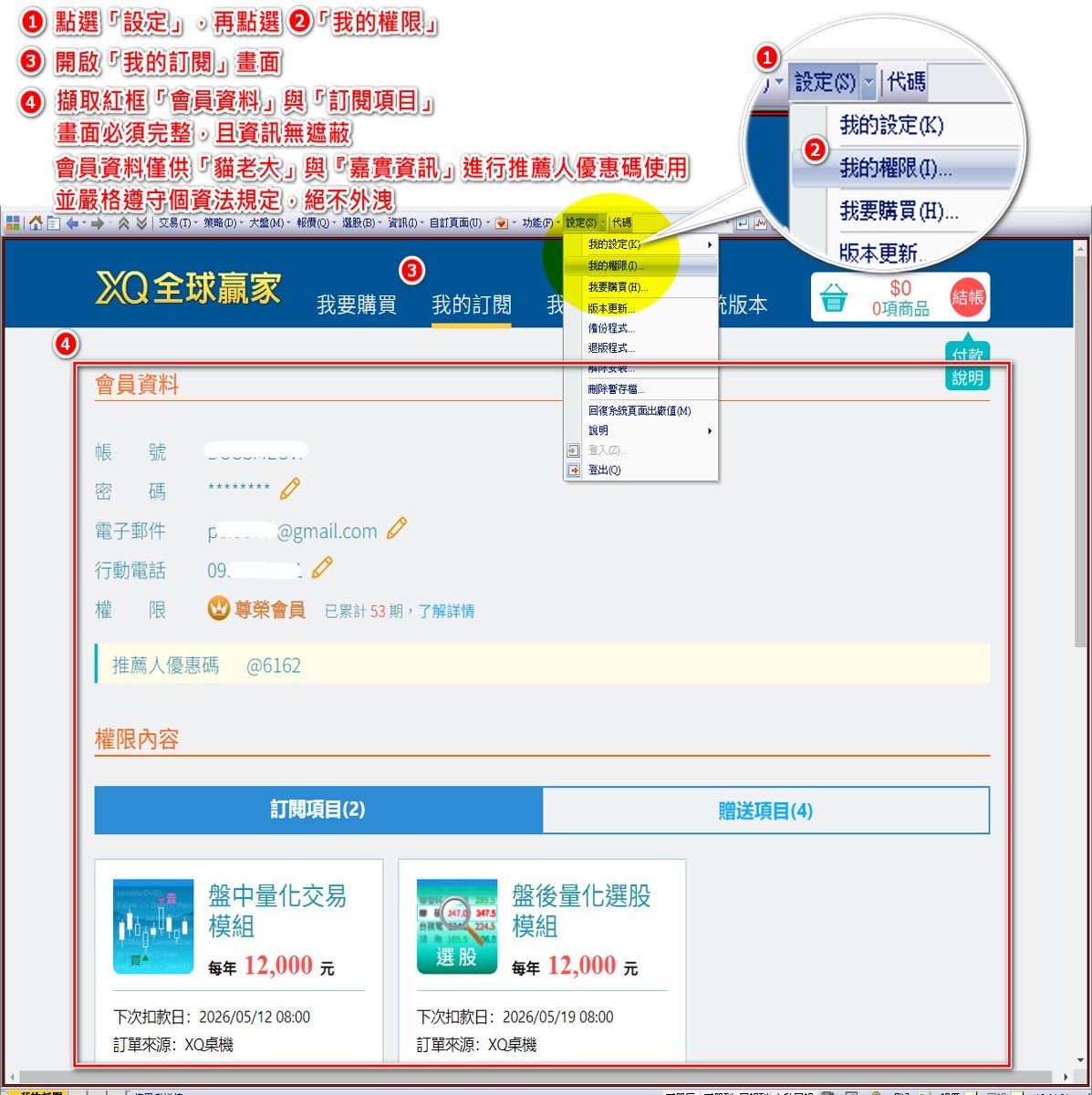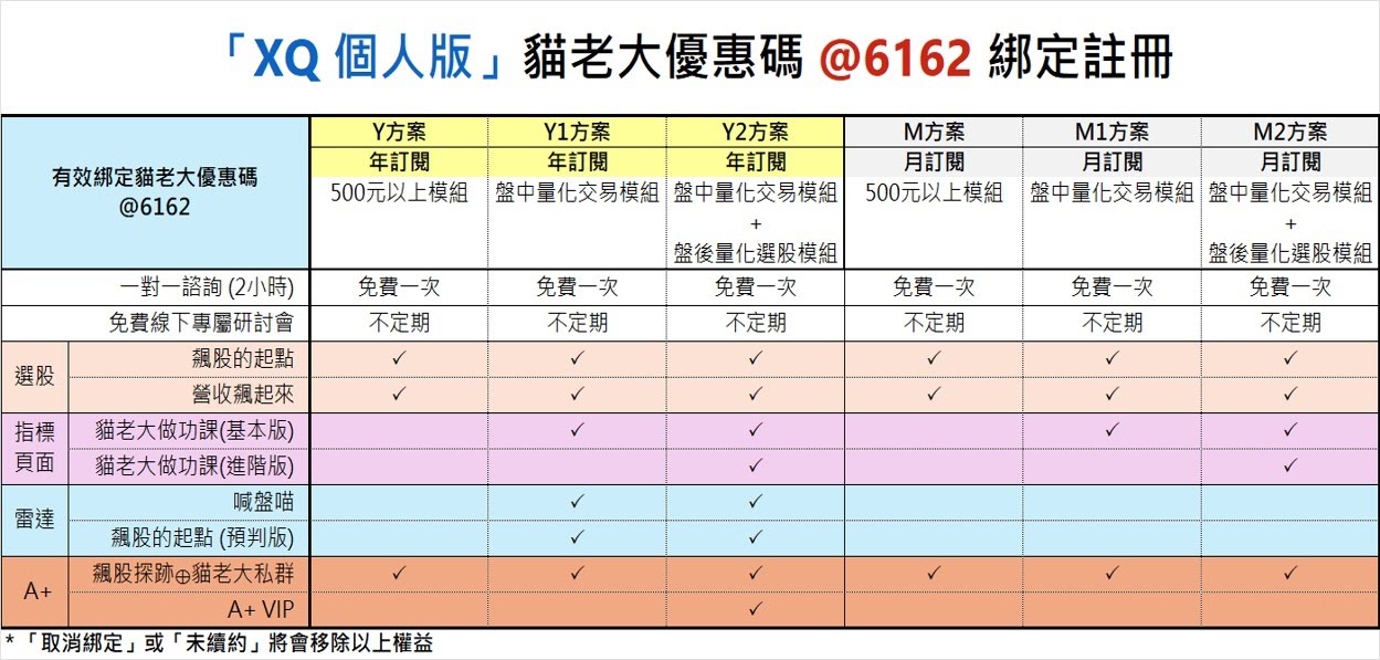 貓老大年(月)訂閱禮包登記 貓老大年訂閱禮包登記表感謝您選擇加入我的年訂閱加碼好禮,我是貓老大,根據您訂閱的模組,會有相對應的禮包給您,請見以下圖片,如您確定要加入我的方案,請填寫下方表單,如果已綁定其他人的優惠碼,也可填表,貓老大會協助處理 開始填寫表單XQ註冊帳號XQ註冊emailA+註冊帳號(如未註冊,請先註冊)A+註冊email您訂閱的模組 Y方案-年訂閱-積木或籌碼 Y1方案-年訂閱-盤中模組 Y2方案-年訂閱-盤中+盤後選股模駔 M方案-月訂閱-500以上模組 M1方案-月訂閱-盤中模組 M2方案-月訂閱-盤中+盤後選股模駔請上傳您的XQ訂閱截圖(如下圖)選擇檔案 上傳表單以下為截圖範例