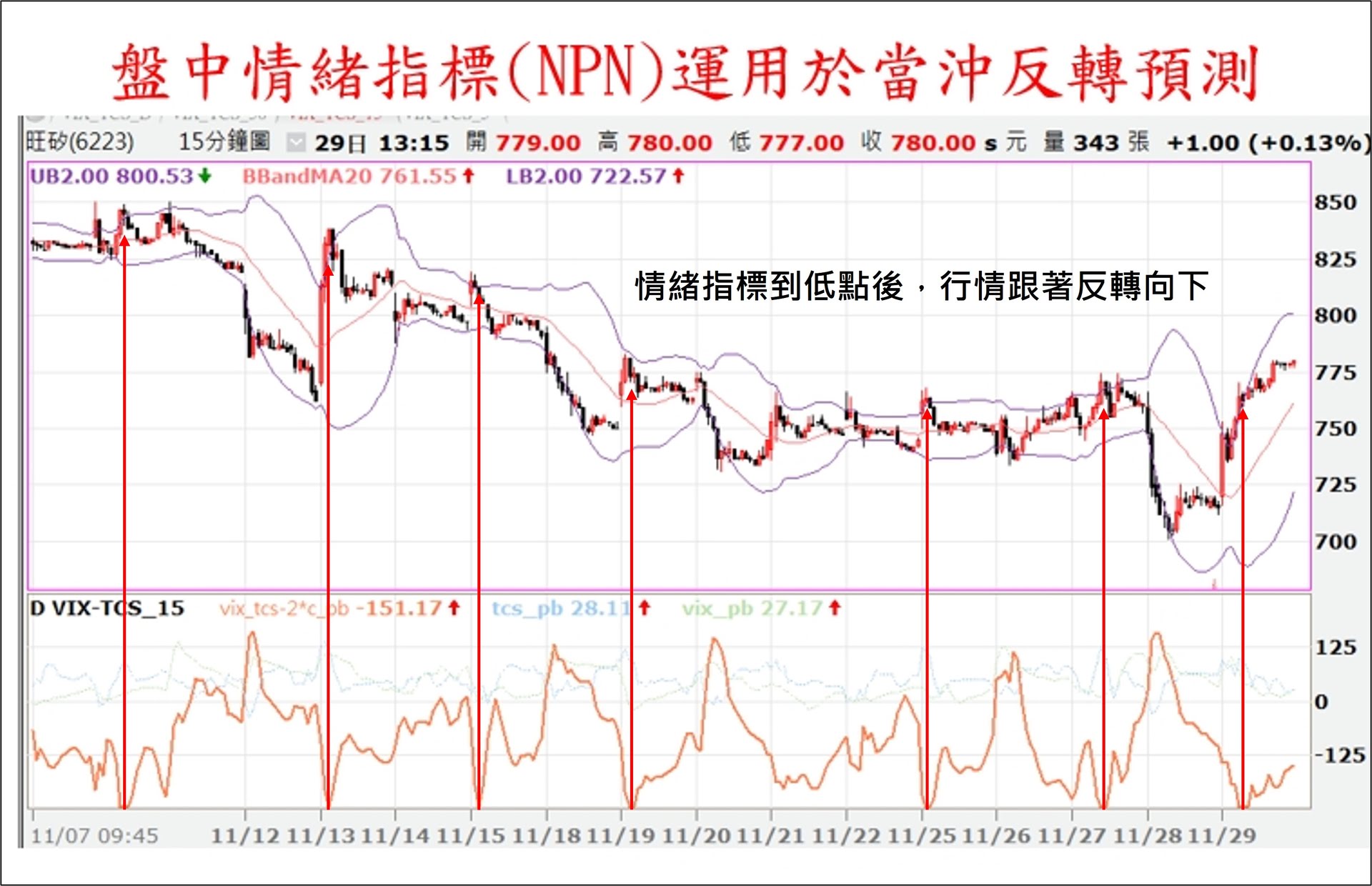 當沖是最困難也是最多人想要學的,陳文賢老師,這次提供了一個盤中情緒指標,可以用來輔助判斷股價是否要發生轉折向下了,以下圖為例,似乎多能抓到反轉點,而且感覺不只是用在當沖,多放空幾天效果似乎更好,能賺到更大一段,如果是做多的朋友,拿來當做是避險的指標也不錯喔