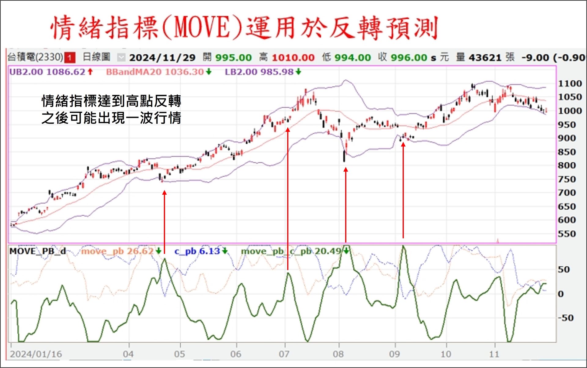 情緒指標除了可以用再當沖放空之外,還可以用在抓波段起漲點,當指標數值達到一個高點後反轉,似乎多是一個波段的起漲點,這種較大的波段漲幅,如自己再搭配移動停利機制,應該很有機會能獲利一大段,而不是每次都賺一點就跑了。