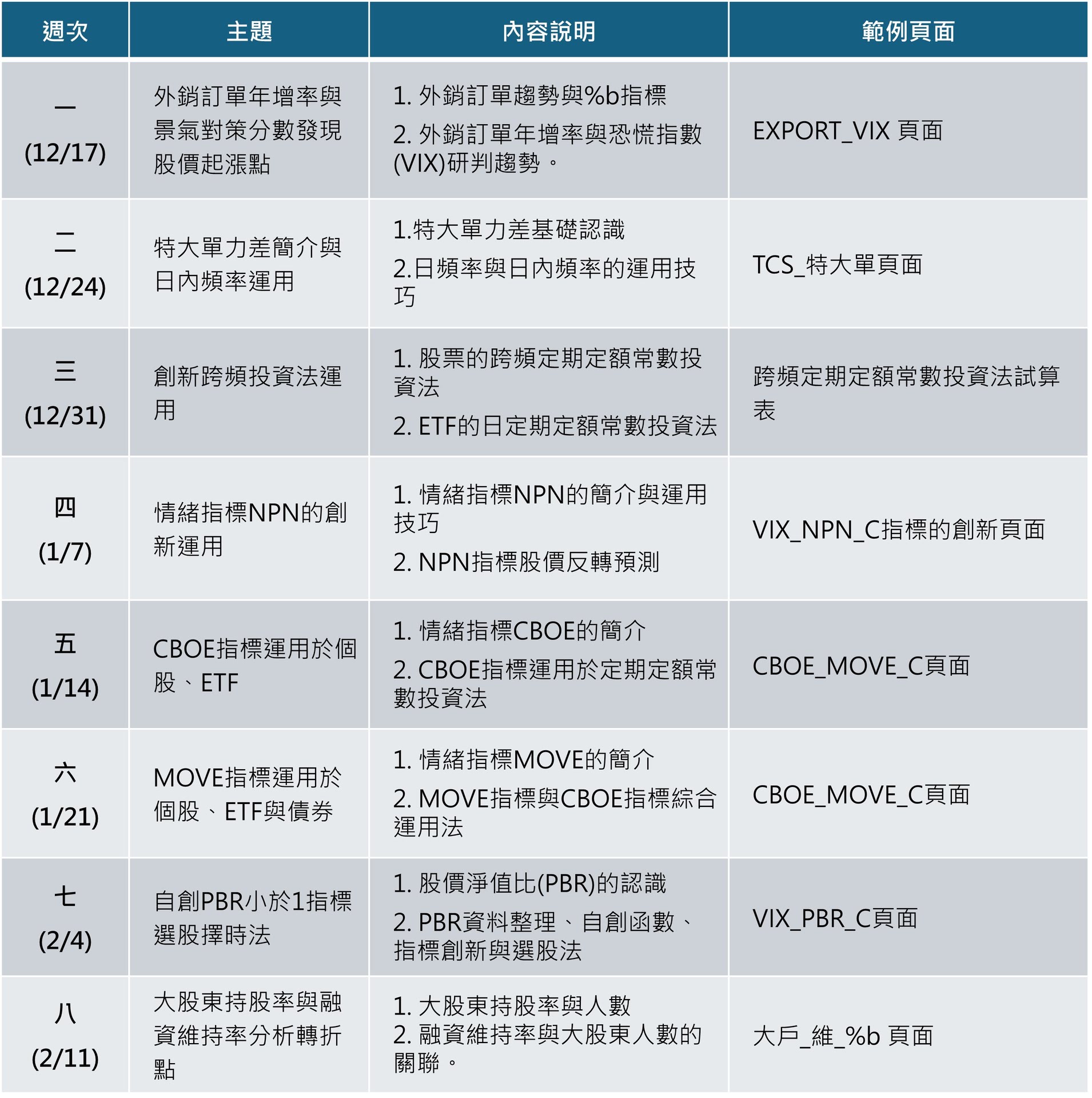 以下為課程大綱,包含了八個主題,並會贈送七個看盤頁面以及一個Excel試算表