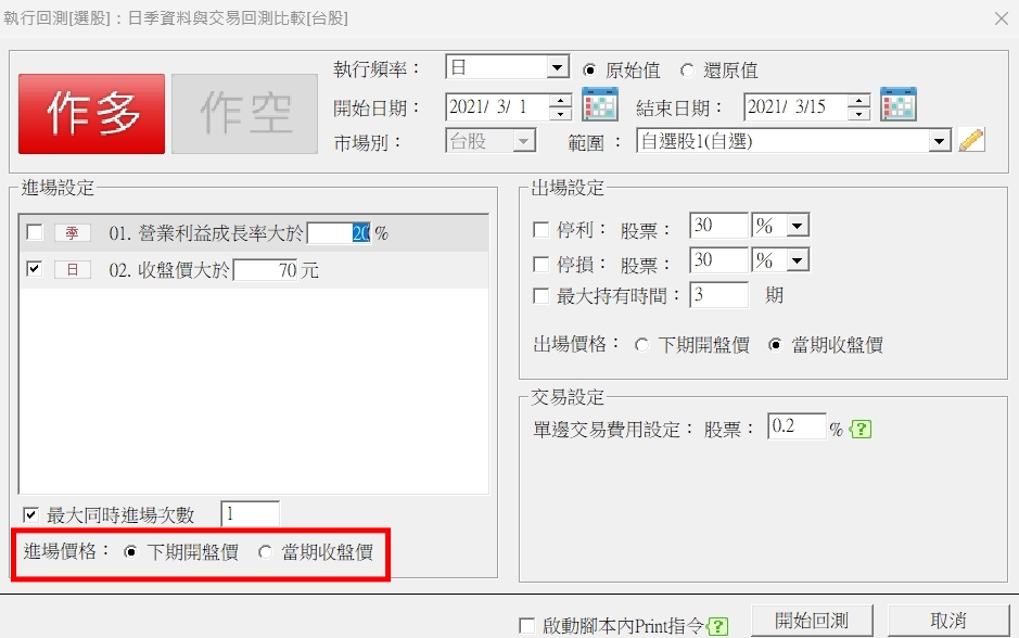 所以在使用選股中心回測時,進場就多是選擇隔天開盤價,就是隔天一開盤就進場