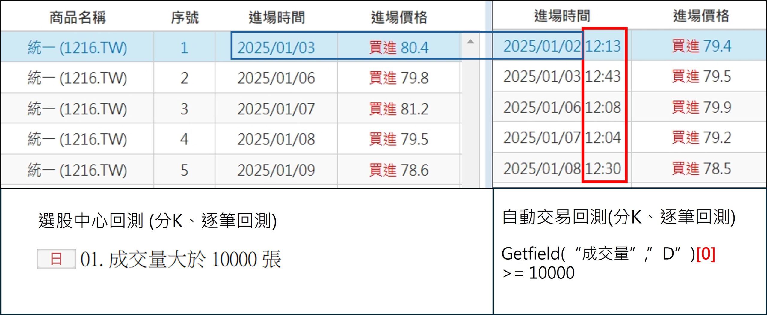 為何交易程式碼用中括號1呢,因為我們要在今天開盤時取昨天成交量大於10000張股票的資料,所以要用[1]去取得昨天的資料,從下圖的選股跟交易回測的結果來看,進場日期與時間都是一樣的,表示這樣的寫法是正確的。