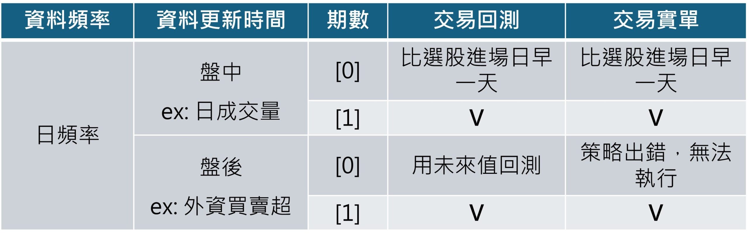 以下表格整理了在日頻率資料下,要取那一期,自動交易的回測與實單才能得到一致的結果。