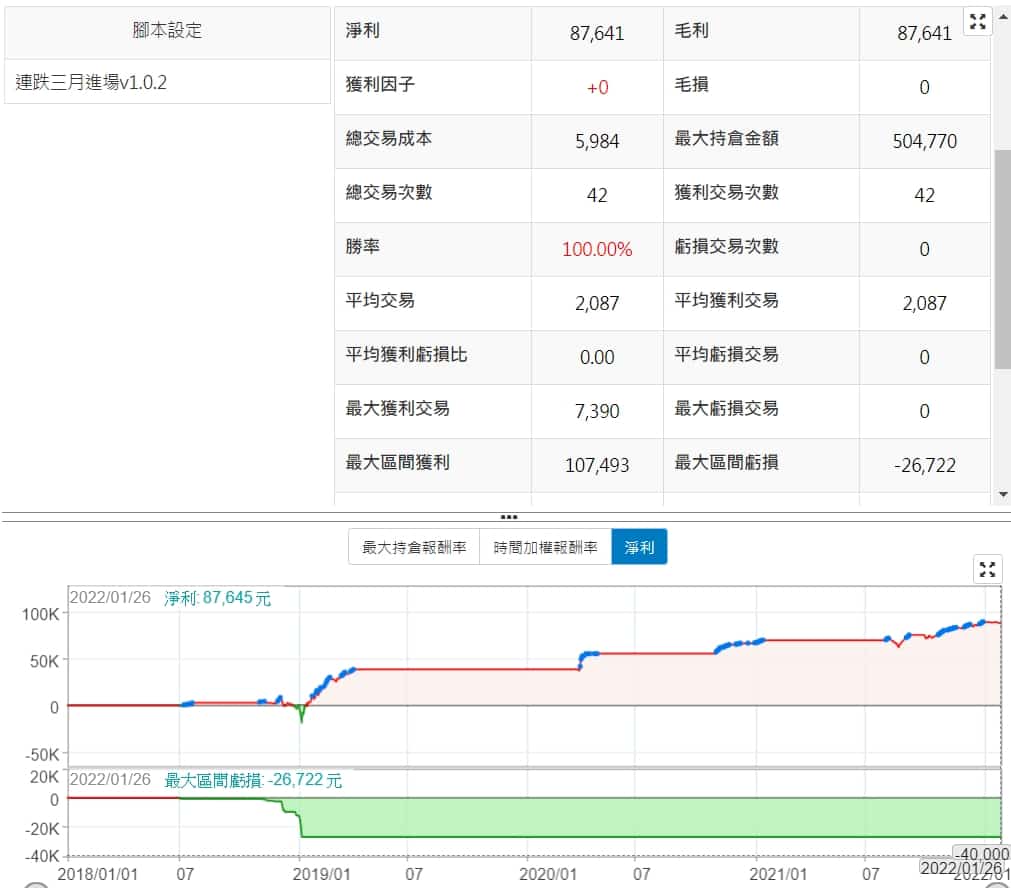 回測結果還是很不錯的,由於沒有停損,勝率自然是很漂亮的100%,不過,我們可以觀察持有時間,最長92天,但大多都是在30天內就獲利5%以上,想要短期賺個5%,應該是個很不錯的低風險策略
