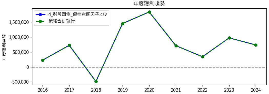 而在每年獲利的統計上,正確依照每季輪動進出的方式,獲利比選股的差一點,但差異不大(651萬 vs 628萬),但在每年獲利統計,這組回測出現兩年虧損。