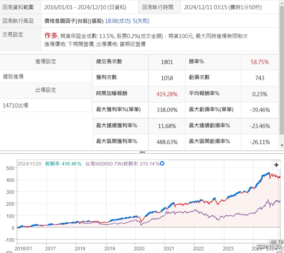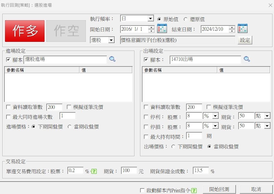 有關雷達設定,可以參照下圖,進場請選選股進場,出場選14710月出場腳本,商品則用選股,找到價格意圖因子策略,及可以回測