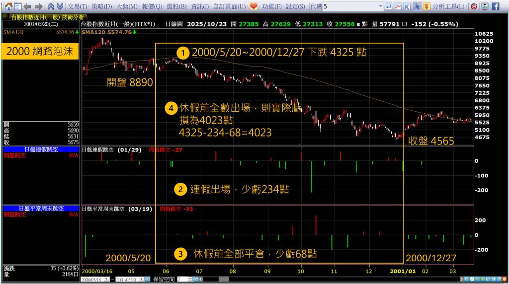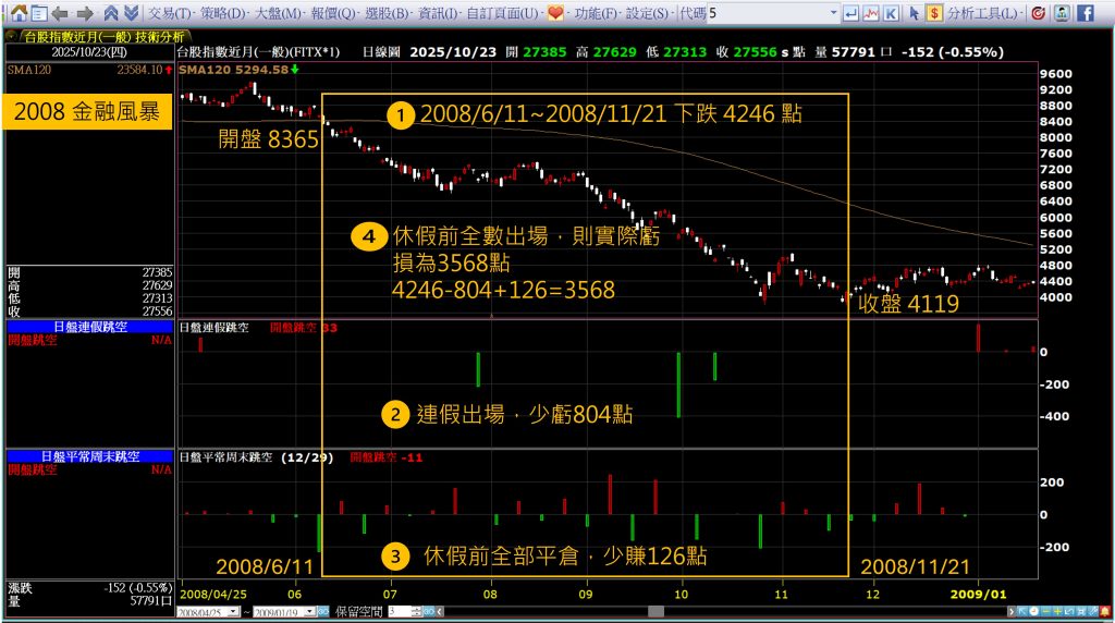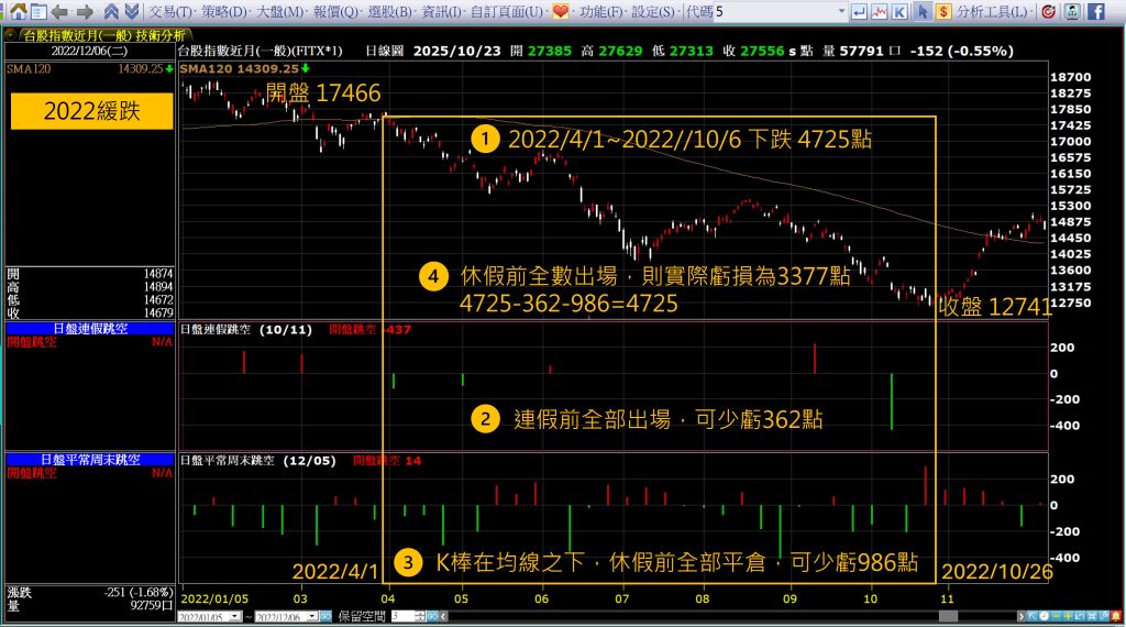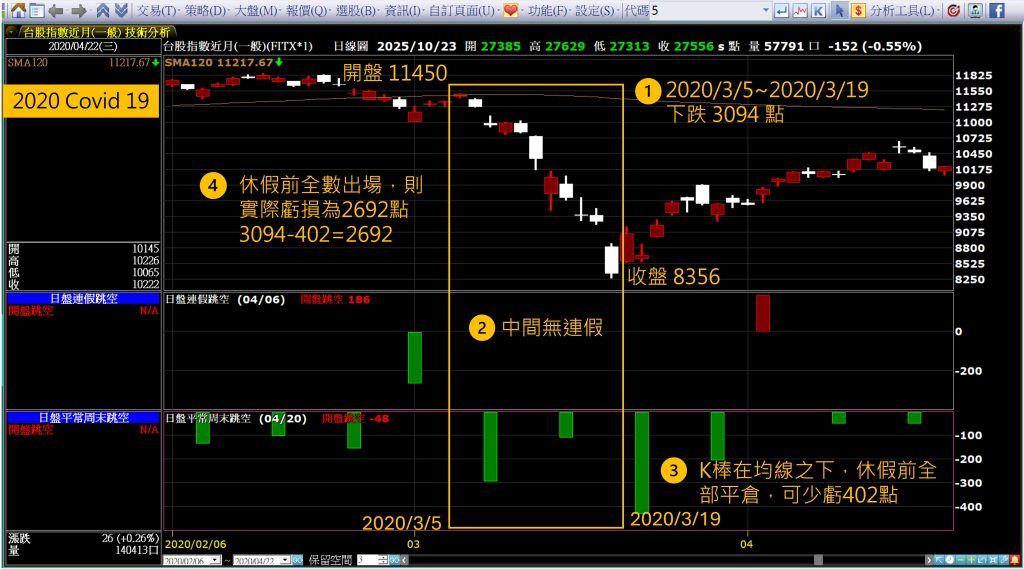 觀察這些較大的跳空多是發生在假日或是連假的時候,所以用了個指標計算如果休假前出場,休假後開盤進場,中間會出現多少跳空,最驚人的是川普關稅政策那時候,清明連假後來一根跌停,跌掉2129點,而且在前一周的周一開盤也出現跳空下跌743點,如果能避開這兩次,就少虧了2800點了,加上跌停後幾天,肯定還是不敢進場的情況下,4/7號那次的大跌,對網格交易人應該沒有造成太大的損傷才是