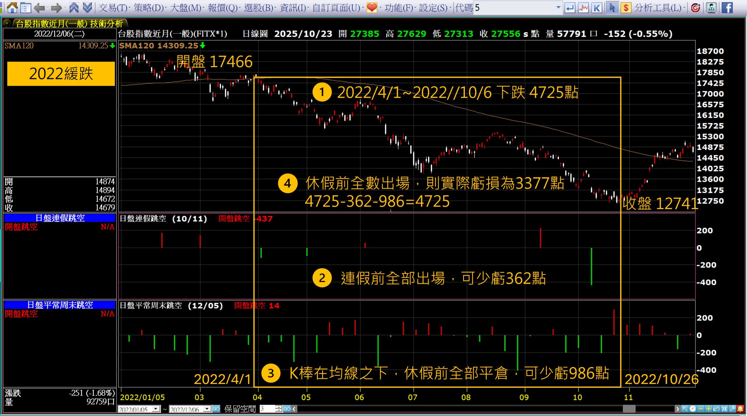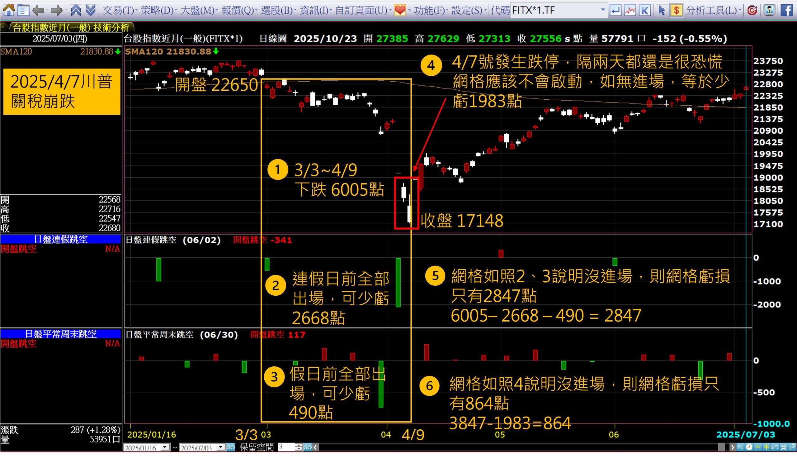 觀察這些較大的跳空多是發生在假日或是連假的時候,所以用了個指標計算如果休假前出場,休假後開盤進場,中間會出現多少跳空,最驚人的是川普關稅政策那時候,清明連假後來一根跌停,跌掉2129點,而且在前一周的周一開盤也出現跳空下跌743點,如果能避開這兩次,就少虧了2800點了,加上跌停後幾天,肯定還是不敢進場的情況下,4/7號那次的大跌,對網格交易人應該沒有造成太大的損傷才是