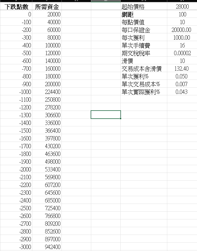 常常有人在問網距要設多少,我覺得最重要的應該是問自己有多少資金,可以承受多少下跌風險,這樣才能正確評估你的網距應該要設多少,做了一張表格,可以計算不同下跌點數,所需要準備的資金,讓你可以根據自己的資金跟風險承受度,決定適合的網距。