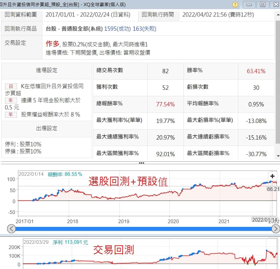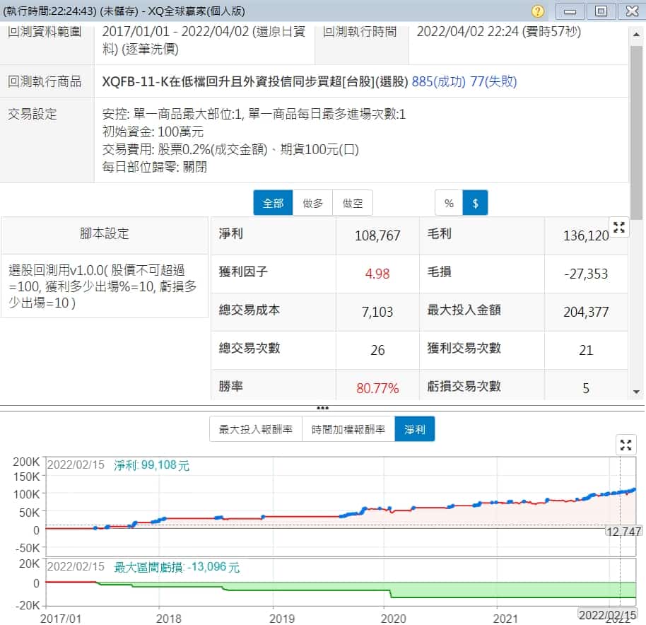既然選股結果都這麼漂亮了,當然是直接用交易模組回測下,出來的結果也是很不錯的,勝率有八成,淨利一路往上,MDD不到7%,次數雖少但值得長期觀察