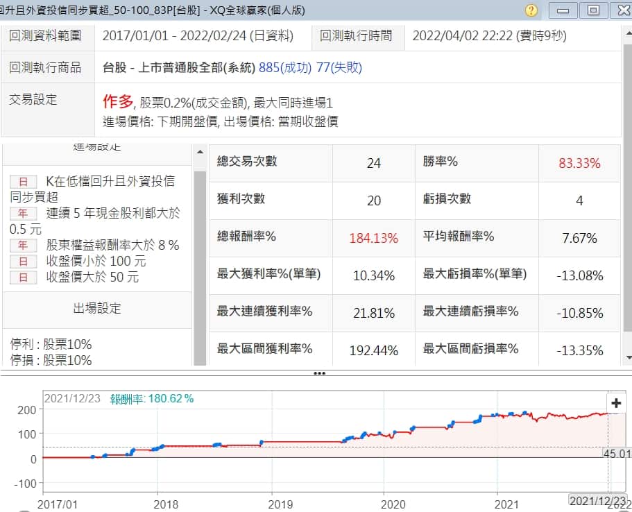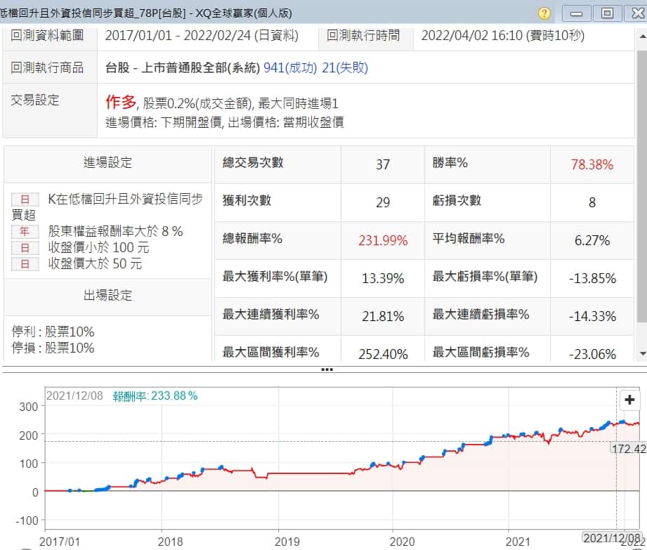 既然價格對勝率影響那麼大,那放寬條件後,是不是勝率還可以很高呢? 沒想到竟然真的可以,把現金股利的條件拿掉,回測後勝率竟然還有78.38%,次數多了13次