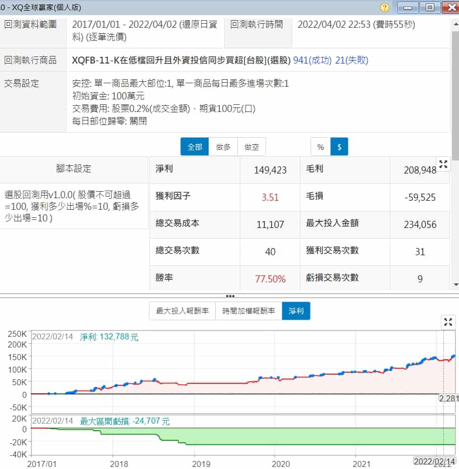 XQ這個技術面+籌碼面策略,是一個交易次數少的策略,不過回測後發現,不管是否有放寬條間,只要限制價格區間,就能得到不錯的績效,甚至能夠將策略的勝率提升到八成以上
