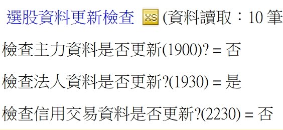 如果你的選股策略,有用到主力資料、法人資料或是信用交易資料,那這個選股資料更新檢查腳本都應該要放入你的選股策略裏面去