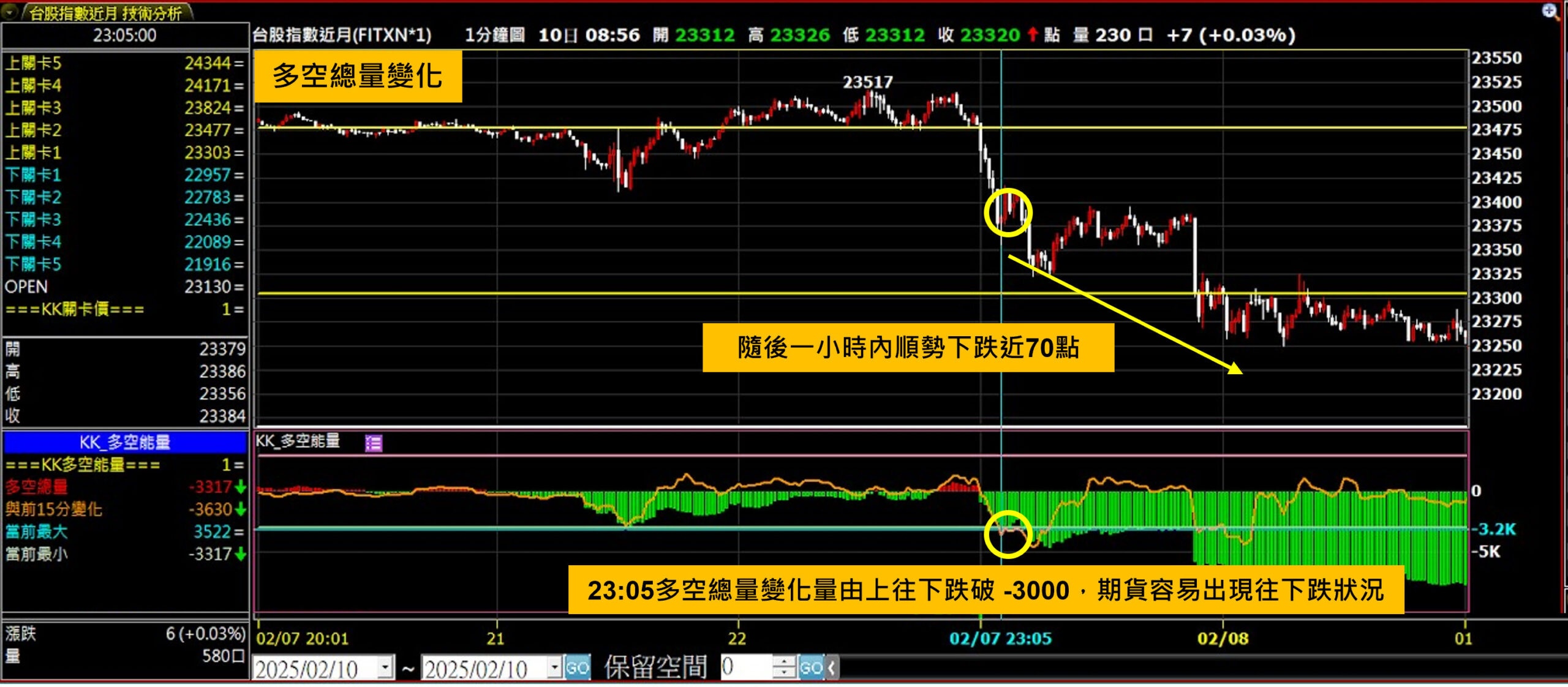 Kai大自己主要會觀察15分鐘的多空總量變化,當這個變化突破3000或跌破-3000時候,期貨短時間內常會出現一波的漲勢或跌勢,就如下圖所示