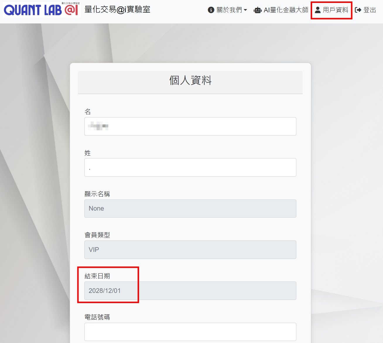 登入QuantLabAI之後,請點用戶資料,就可以看到自己的到期日了