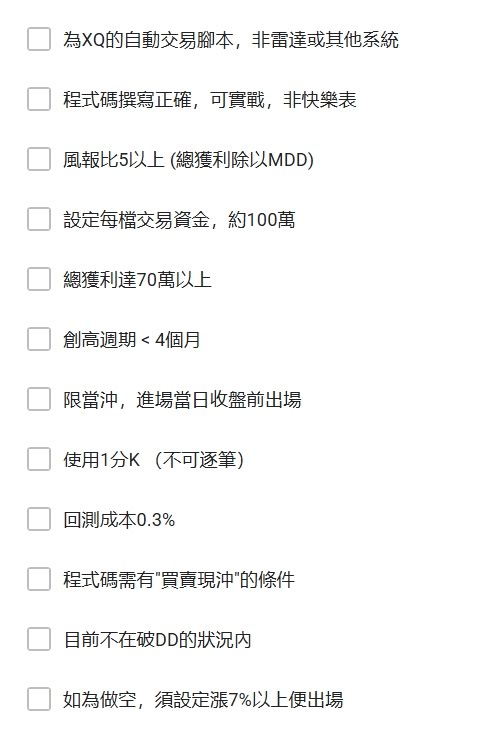 如果你才剛開始開發策略,可以用以下的標準來開發自己的策略,這是賽大用來評估一個策略是否能上架的標準