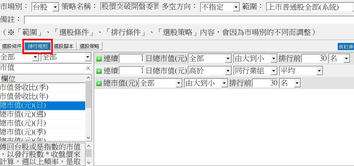 而如果用排行裡面的市值,就可以在回測時,依照不同時間點,排出真正前幾大的股票,另外,還可根據產業內的公司來做比較,找到產業內真正強的,這在策略開發時,都是非常好用的