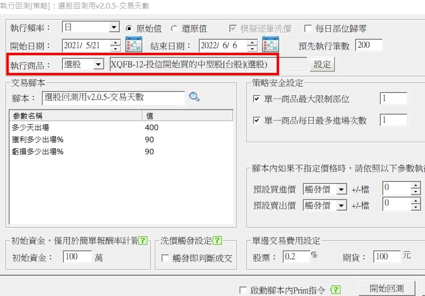 在發現了這個新的方式後,我將策略分成了兩個部分,主要策略條件都是在選股,而交易模組,只有控制,剛選股模組在隔天選出商品後,隔天開盤進場,以及後續出場而已,之所以一定要用到交易模組,前一篇文章有講到,因為我要看淨利的報酬曲線,並且,我是要做到自動化交易,我才懶得每天盯盤咧~~ 😀