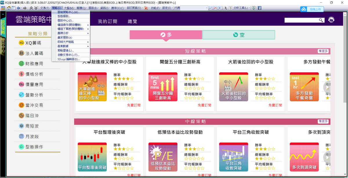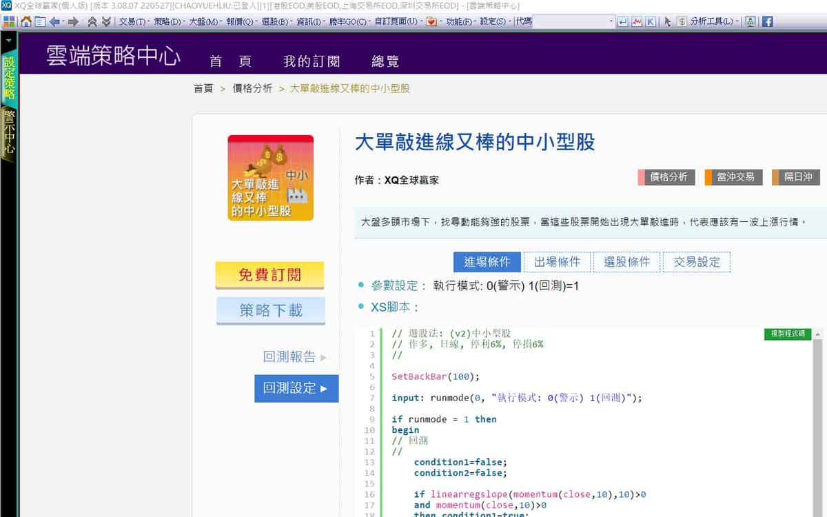 開啟XQ軟體,到策略下的雲端策略中心,就可以看到一堆策略,點選任一策略,再點回測設定,就可以看到程式碼了