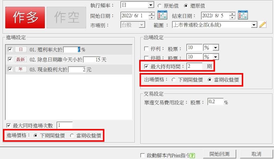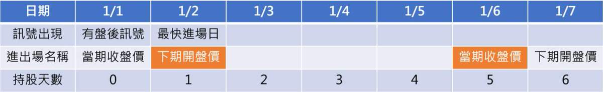 不管進場時,選的是下期開盤價或是進場收盤價,在選股策略內,都是把下期開盤價當做是進場的起算日,搭配上面的出場說明,應該就很容易知道這個持有區間如何計算的吧