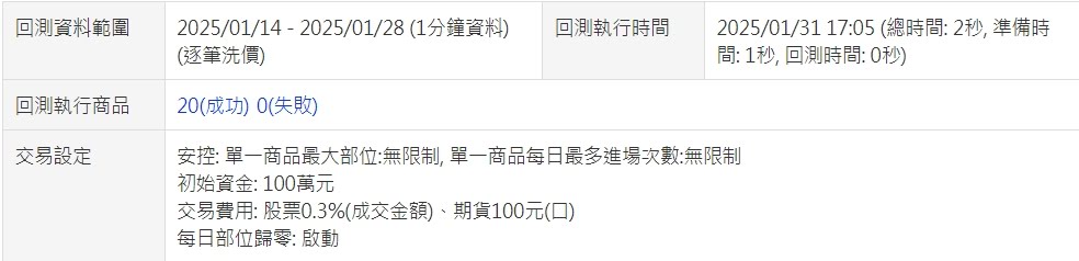 回測介面的買賣價方式與讓價幾檔的設定,在回測報表內並沒有提供這樣的資訊,未來想要重新回測時,因無法得知原本的設定,很容易造成回測的不一致。