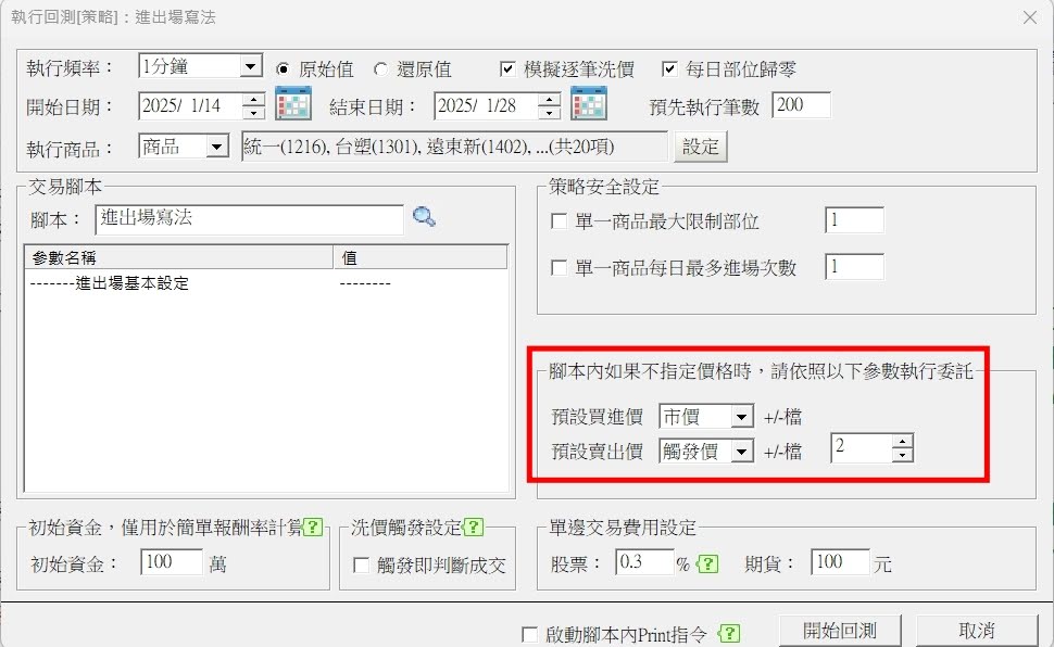 當我們使用了上面其中一種寫法,回測設定頁面的買賣價與讓價檔數就可以不用在理他了。