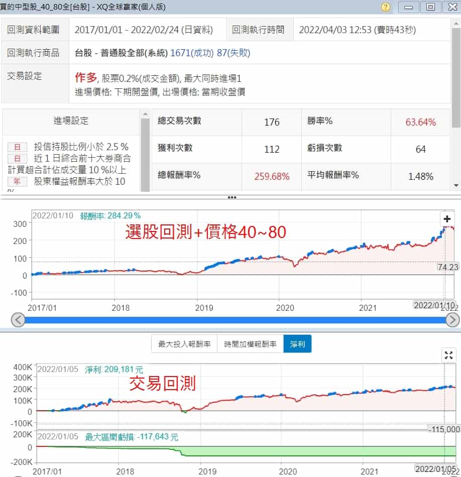 這個策略只要價格在40~80中間,調整其他參數的績效都還不錯,可以自己DIY一下,看看勝率能否突破到8成。
