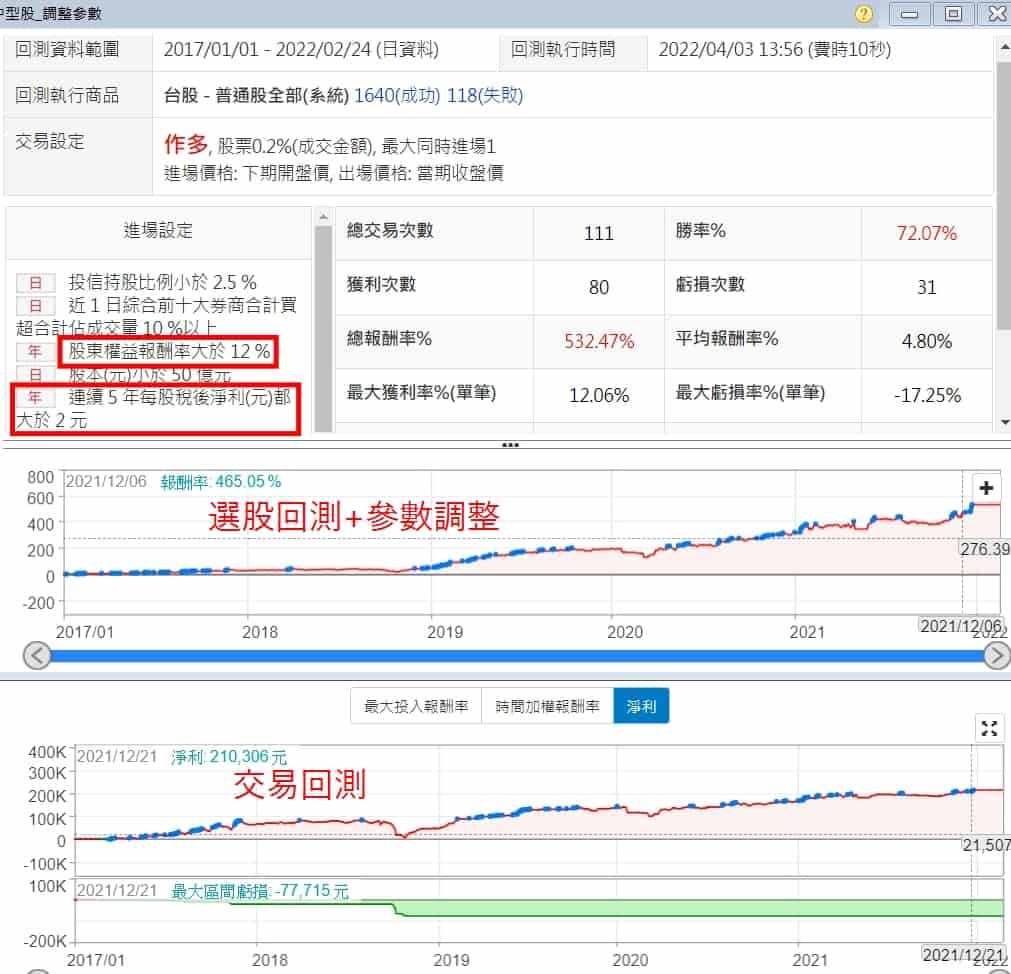 用上面選股條件做交易回測,2018年底的表現好多了,勝率將近78%,五年報酬率78%,一年15%的報酬,很不錯了,雖然最近半年似乎沒創新高,但趨勢也是向上,離創高不遠了