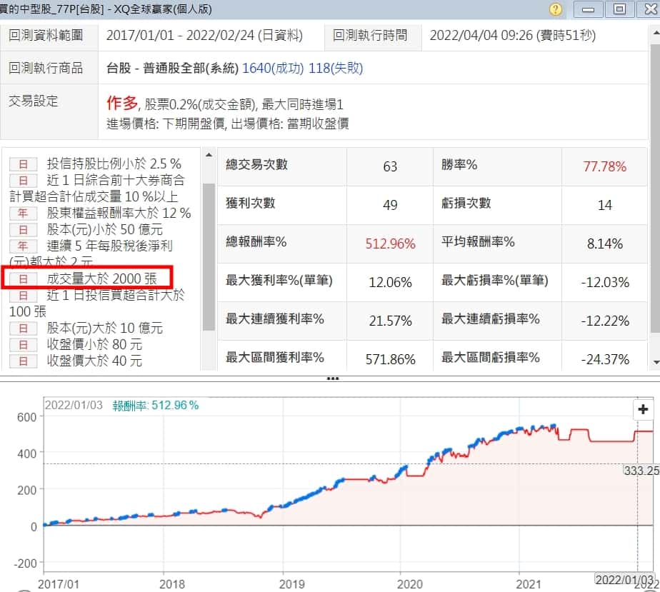 2018年底的虧損有點大,看起來不是很爽,所以又測試了不同的參數,沒想到把成交量增加為2000之後,勝率一下提升到77.78%