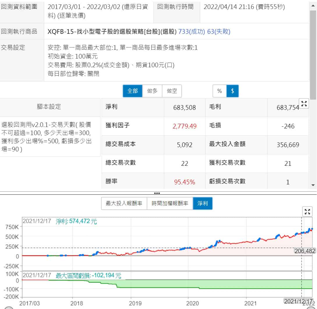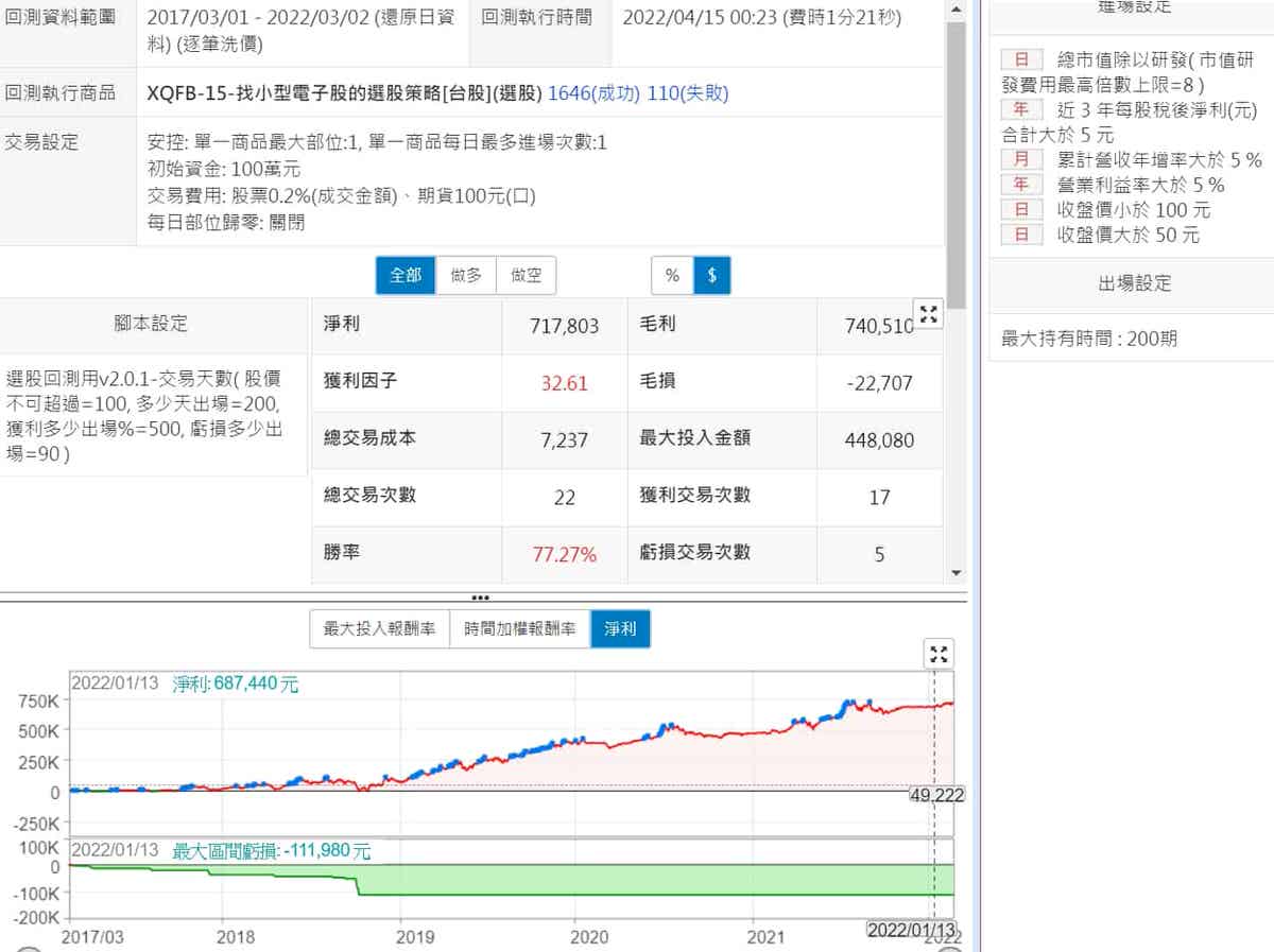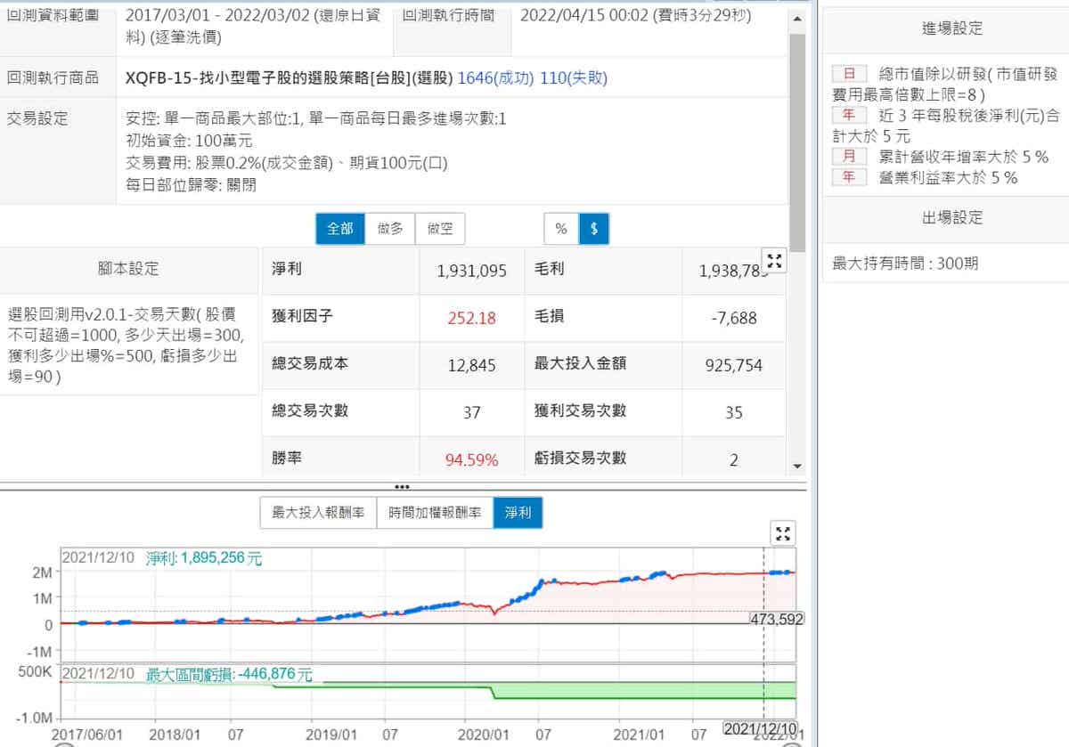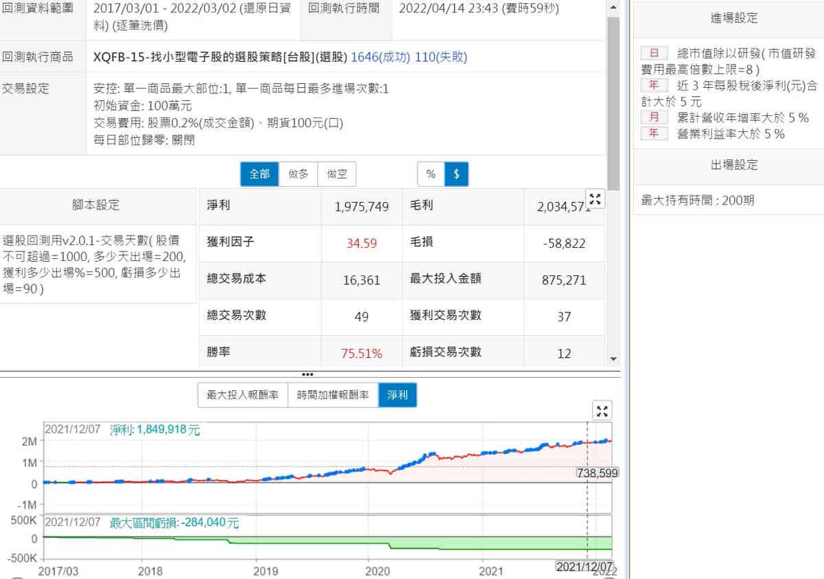 XQ這個策略還滿特別的,算是在找潛力股吧,提前布局,等待研發成果出來後的大爆發,因此,這個策略的特別處在,不設定停損利,只設定了固定時間出場,讀者可以自己調整,加入停損利的條件