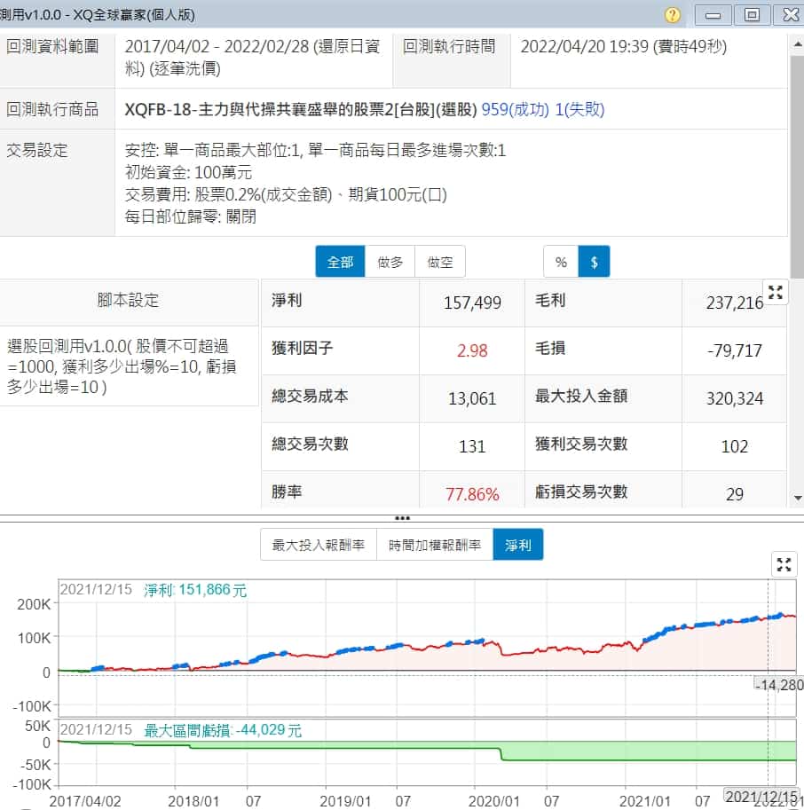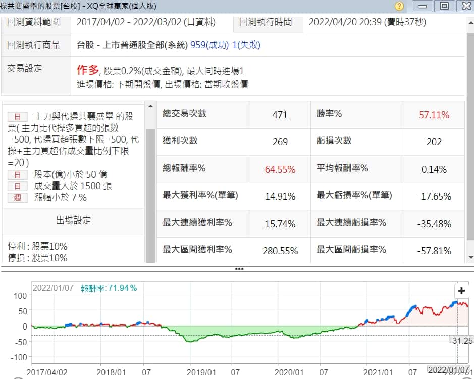 經過多次的回測,結果多不盡理想,因此做了一些調整,增加了價格限制、市值限制、代操+主力買超成交量比例上限,並取消股本小於50億的限制,在調整過後,回測的數據果然漂亮許多,勝率達到78.52%