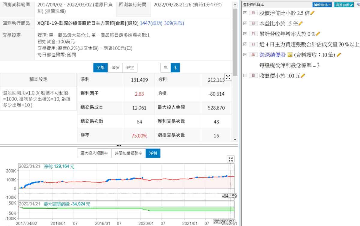 XQ的跌深的績優股近日主力買超策略,不會在崩跌時就急於進場,而是等待主力開始進場布局時,才跟著一起下場,會測起來的勝率滿高的,且不會一堆股票都集中在大盤崩跌的時候進場。