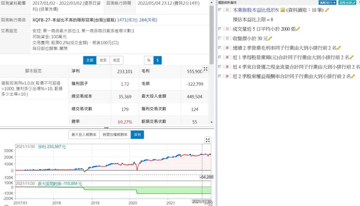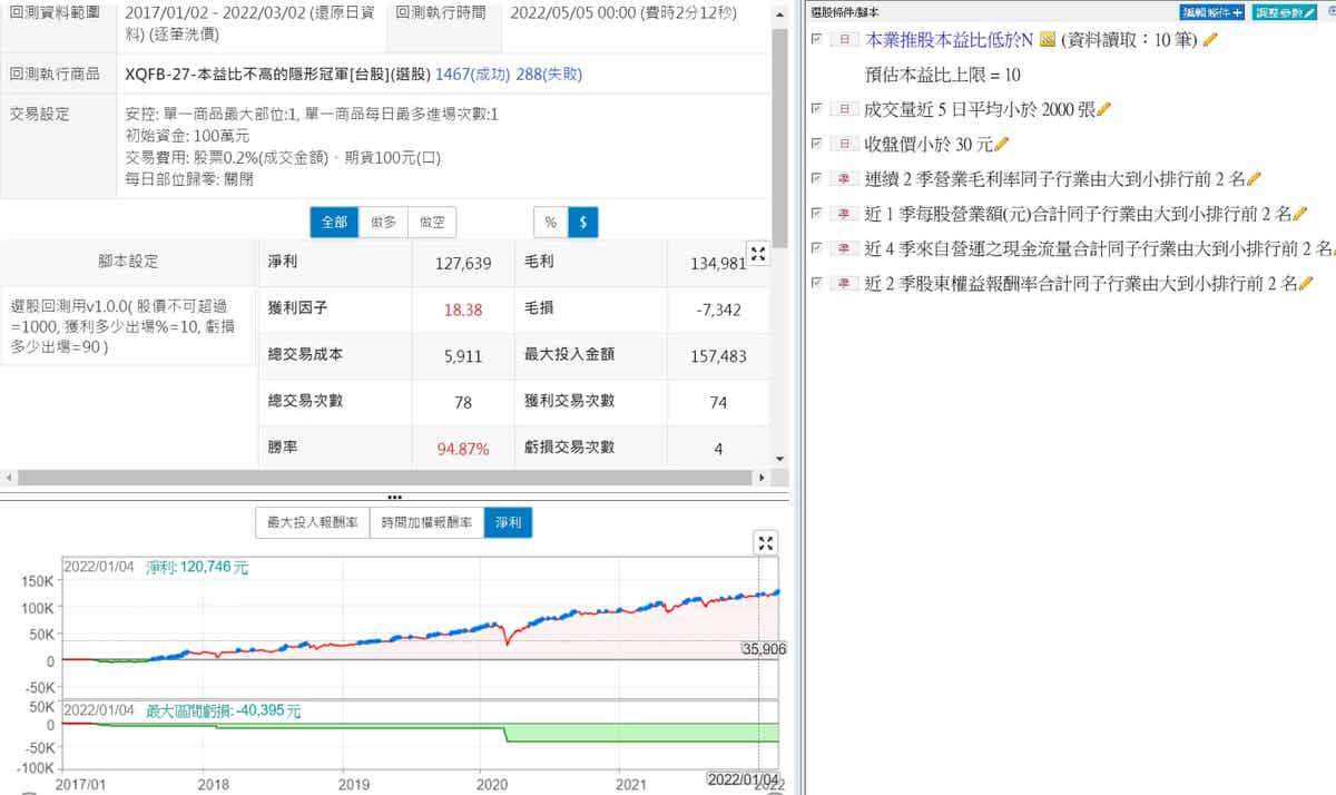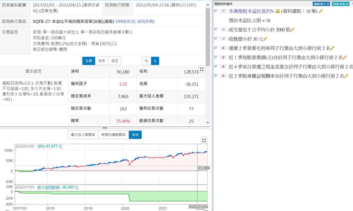 XQ的這個策略除了推估本益比之外,運用了很多排行的條件,回測出來的績效還真是不錯,只是做了一點調整,整個淨利就幾乎一路向上,勝率也都超過七成。
