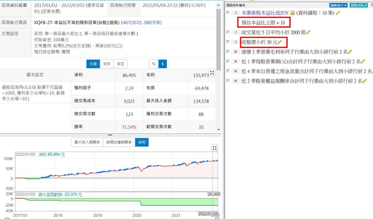 調整本益比上限並限制價格要30以下,整個績效變得更加穩定,淨利幾乎一路平穩向上,勝率超過七成,五年報酬率有64%,最大虧損大約17%,都在可接受範圍內,且投入資金真是不多