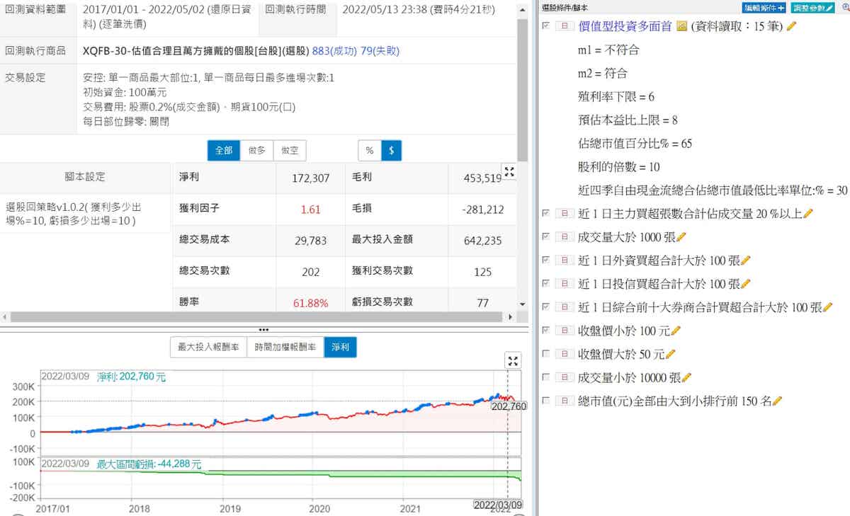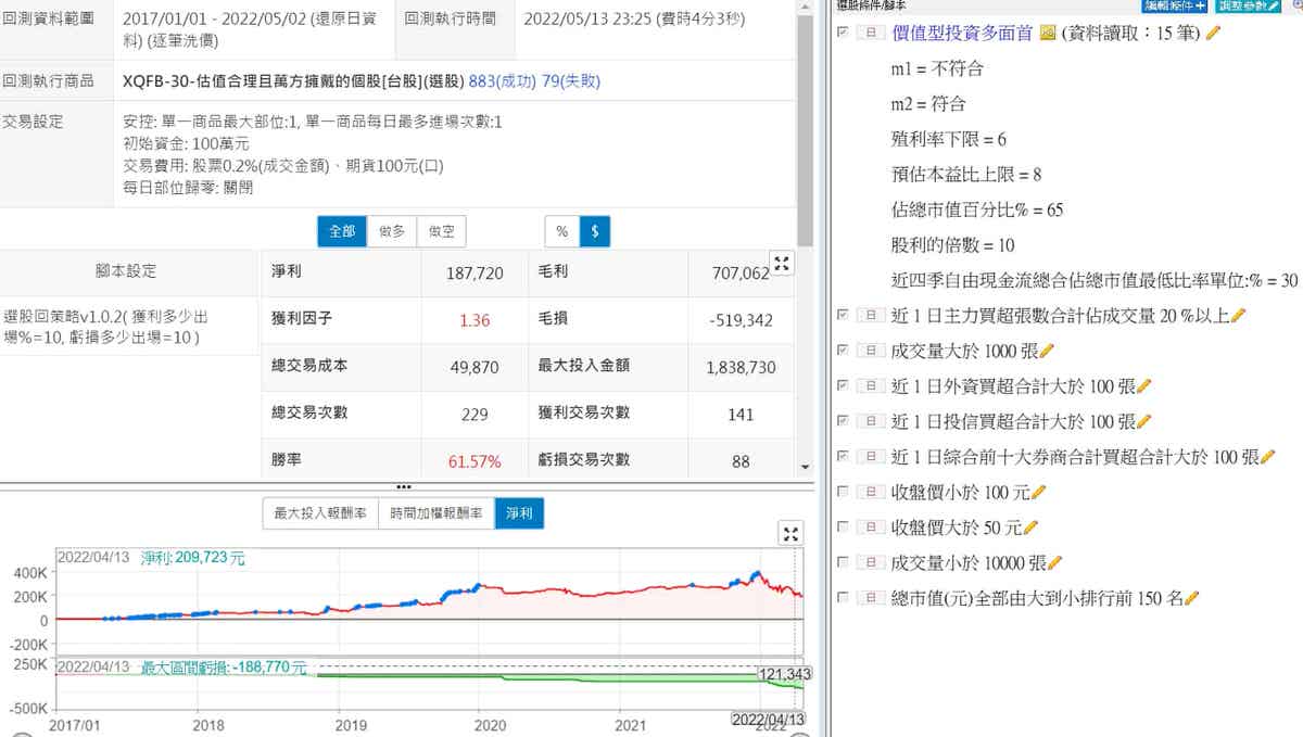 XQ這個策略運用了類似計分模式,需要通過兩種以上估值標準才能成立,且又須要符合多種法人、大戶等條件,能通過之股票不多,不過,優化倒是簡單,僅僅做了價格限制,就能讓淨利呈現一路往上