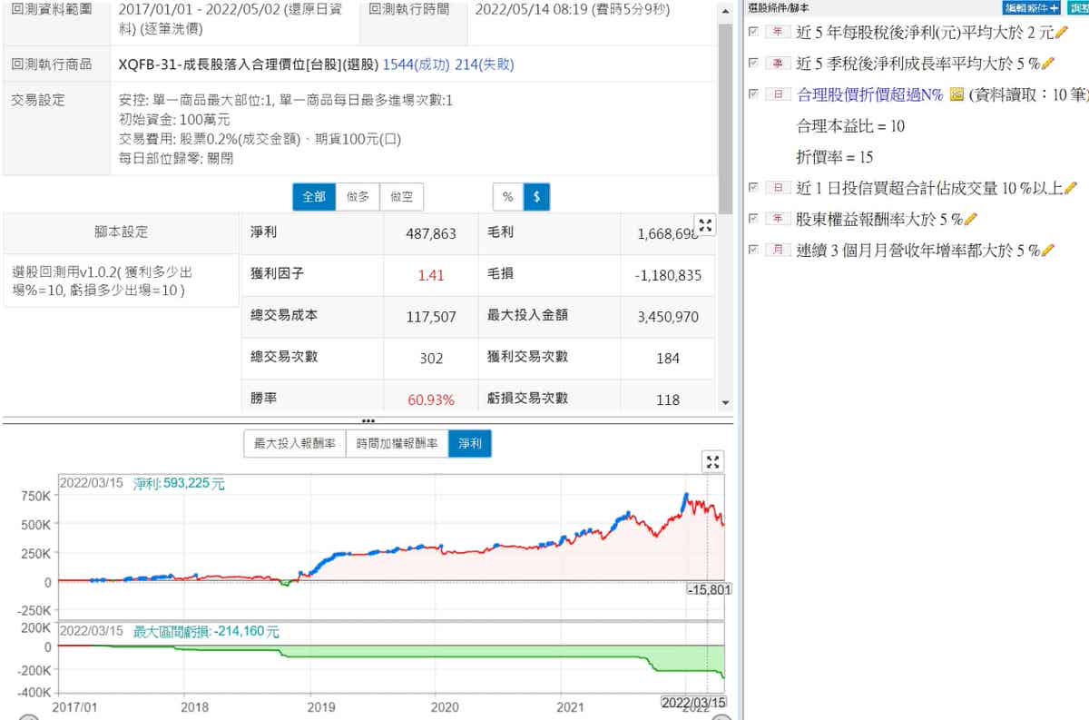 採用預設值+全部上市櫃股票+停損利10%做回測,從淨利來看,2019年之後表現似乎還可以,但需要改進2017~2018這兩年的績效,另外,最大投入金額過於巨大,要345萬