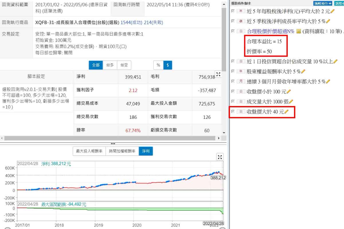 這個回測做了比較多調整,調整了參數(見圖),並且將價格限制在40~100中間,因為發現2018年底的虧損,多是40元以下價位的股票造成的,停損利除了原本的10%之外,增加120天要出場條件,回測結果,勝率達到67%,也改善了2018年底較大的虧損,雖然2020年沒啥創高,但也沒啥虧損,可以接受了,剩下就是要觀察這段時間的表現了,看看過陣子能否創高,這樣應該就能安心點了