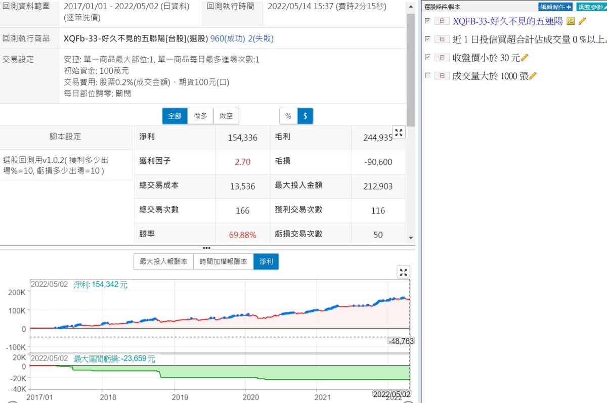策略可調整地方並不多,將近一日投信買超占成交量降為0%,並增加價格限制在30以下,沒想到這樣簡單的調整,淨利就可一路向上,勝率一下增加到69.88%,五年報酬率72.5%,等於一年有14.5%報酬率,很不錯了