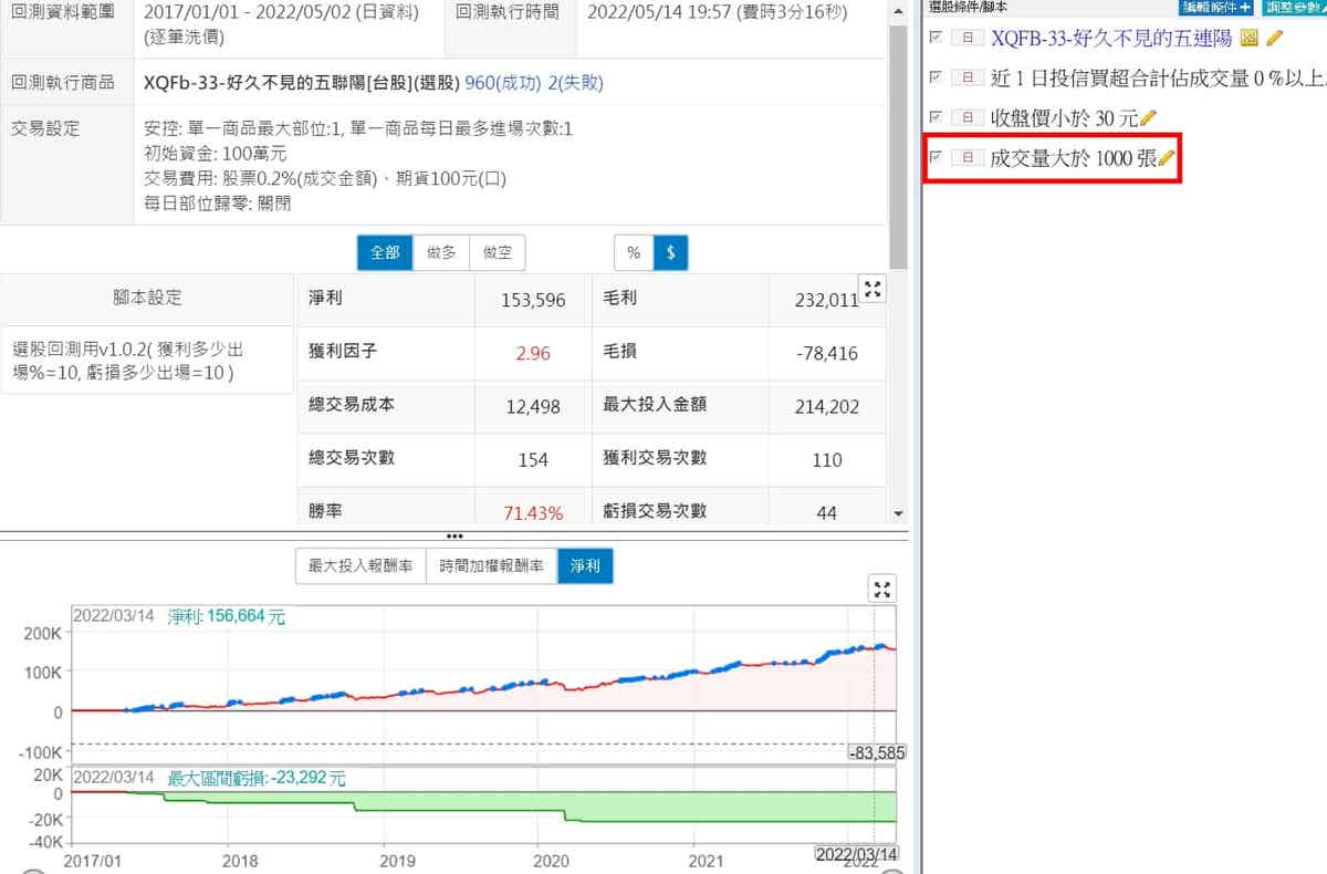用上面的條件再加上成交量1000以上的限制,表現又更好了一點,勝率突破7成,報酬率差不多,另可注意,這個策略從3/26到5/6都沒任何股票進場,似乎能夠避開大盤盤勢不好的時候,可再多觀察下