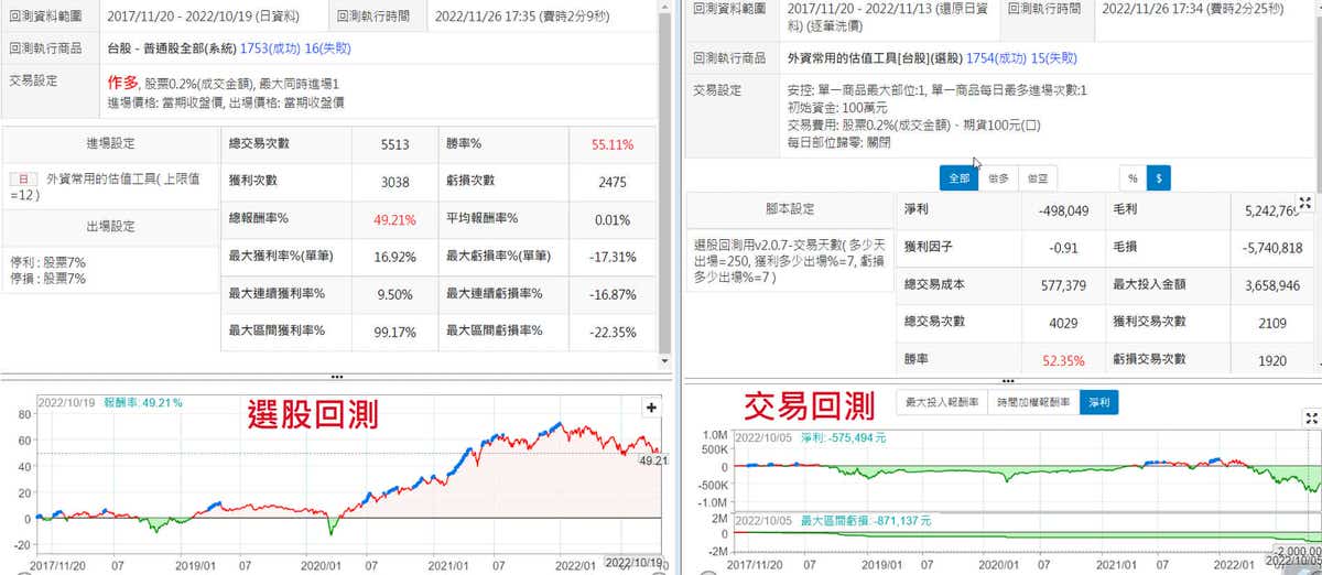 在採用預設值回測,選股回測結果看起來似乎還可以,但是一用交易回測,這個績效就完全走樣了,之所以回呈現這樣的結果,估計是有些價格較高的股票虧損而造成的,之後的回測可以嘗試做不同價格區間的回測比較